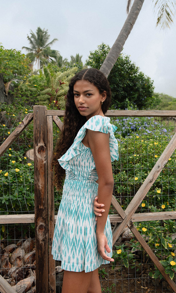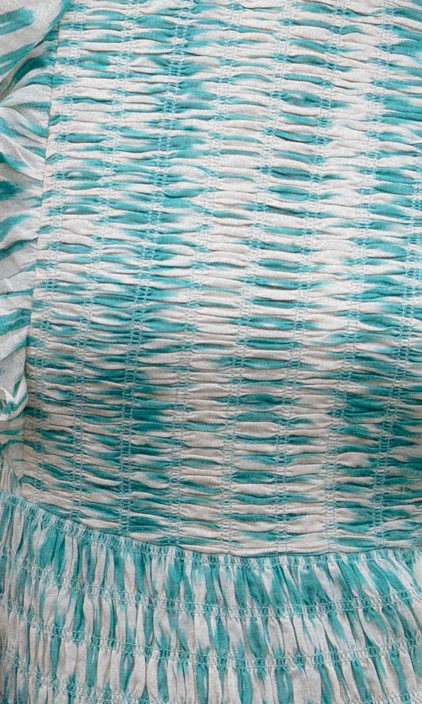 • Teal Ikat • Self: 100% Cotton • Unlined • Tie back • Stretchy- smocked bodice • Dry clean only • Imported, India • Model is 5'10” and wears a size small  Size Chart