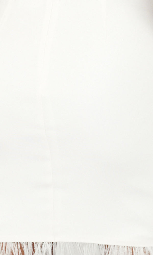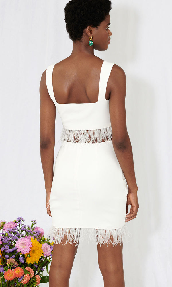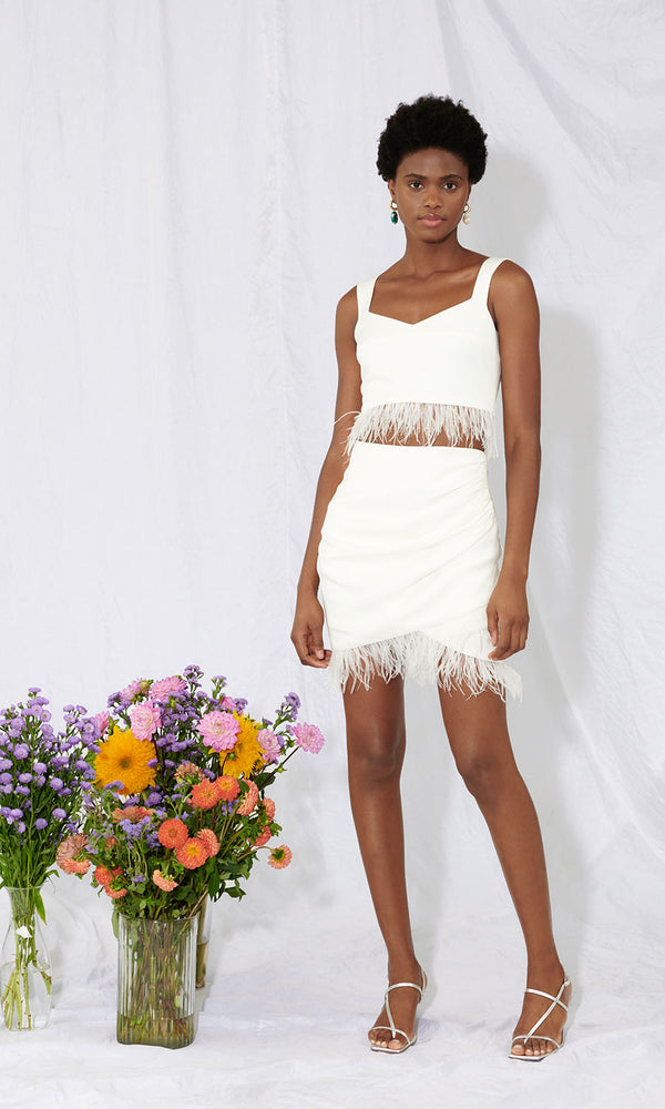 Sumptuous two piece sets for the season ahead, and Benni is the one you need! This feathered two piece tank and mini skirt set feel simple, yet polished. Complete with a sweetheart neckline, wrap style mini skirt, and an ostrich feather trim. The...
