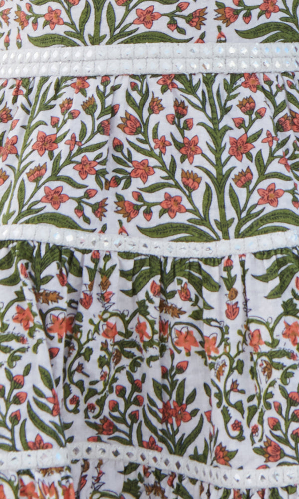 Spring for it! Our new Campbell mini dress is ready to liven up your spring wardrobe. The flirty mini is cut from a poppy floral fabric, that's block printed by hand. The mini dress has a straight neckline, mirror trim...