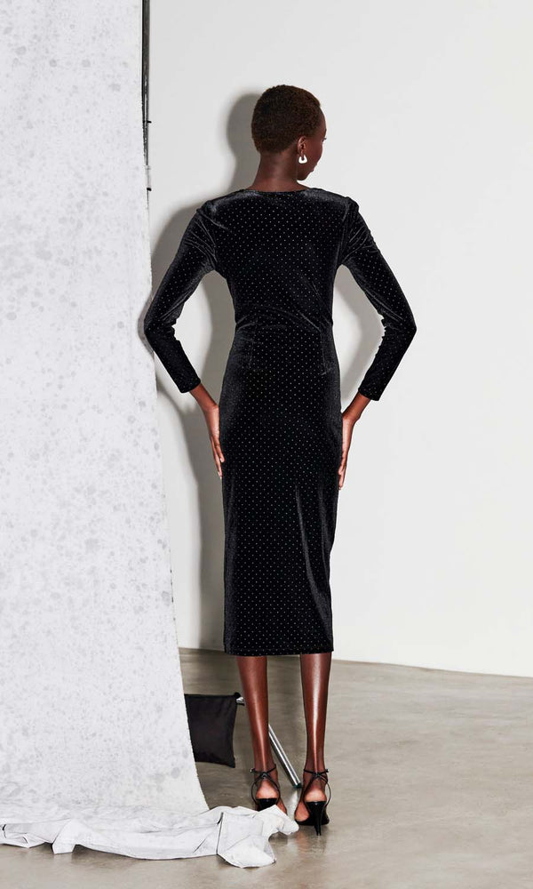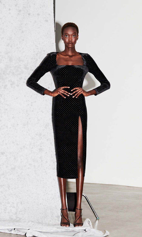 Fitted, flirty and ready to make a statement. Our straight neckline Cecilie Dress, cut from a soft velvet and embellished with rainbow rhinestones is your new go to holiday dress. The simple, yet elevated, dress pairs perfectly with heels or...