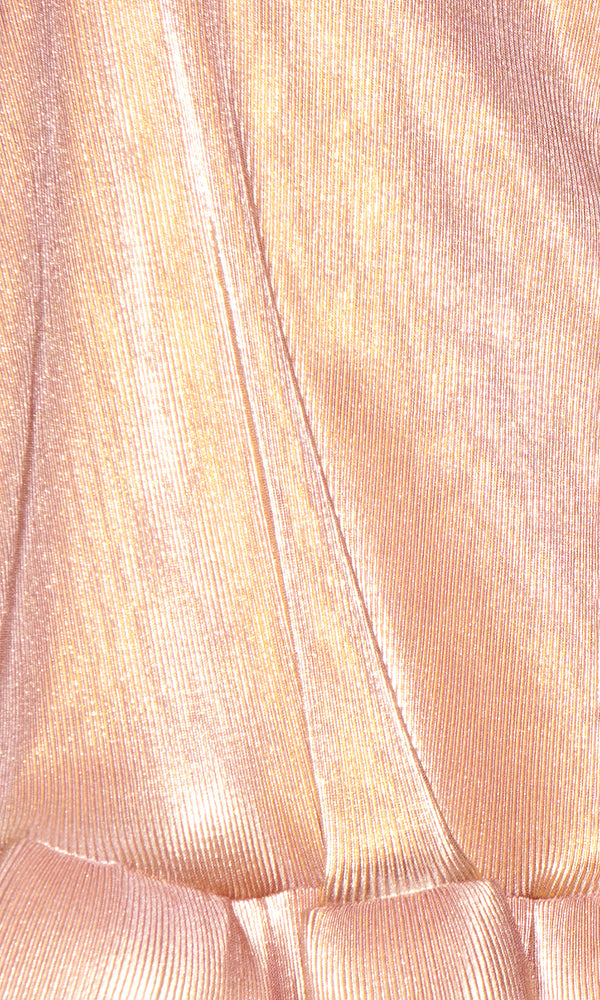 Cheers to our charming Charmaine! The metallic pleat a-line mini is finished with horsehair trim at the hem which gives gorgeous shape to the rose gold piece. The high collar neck is finished with a bow on the back of...