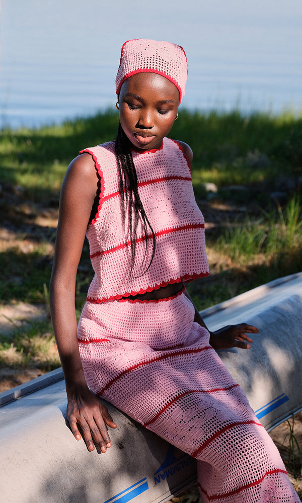 Wrap your hair in style with our Cody— a charming crocheted bandana that brings boho vibes to any look. Crafted in soft pink with delicate red trim, this handmade piece adds a playful pop of color while keeping your hair...
