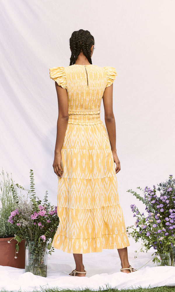 Be your own sunshine with the Alanna dress. This sunset gold midi dress has a bohemian inspired design; with a smoked bodice, empire waist, and tiered skirt. The fit and flare midi is light and airy, with a beautiful ikat...