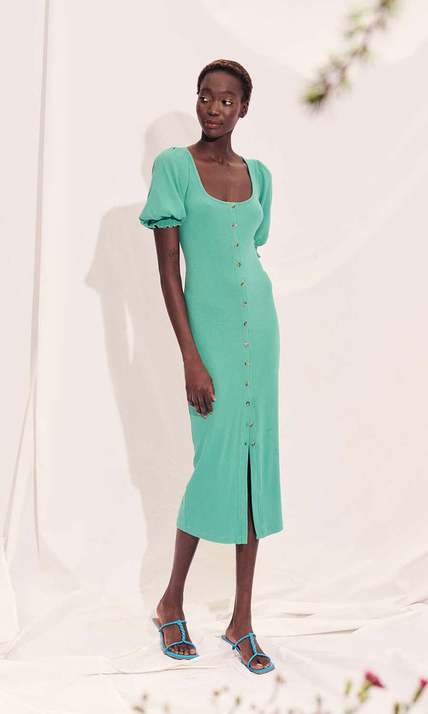 The Malavika midi dress is simple and perfect for everyday wear, yet still stylish. The midi dress features a scoop neckline, cute puff sleeves, and buttons all down the front in a stunning teal color. Cut from a comfy rib knit, it's...
