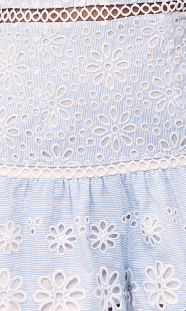 Our Shanice is back and better than ever. This yankee pinstripe romper in crisp cotton daisy eyelet has everything you need (and more!) Decked with delicate daisy eyelets, scalloped hems, dropped sleeves, and a sweetly framed back cutout. The eyelet trim shapes the...