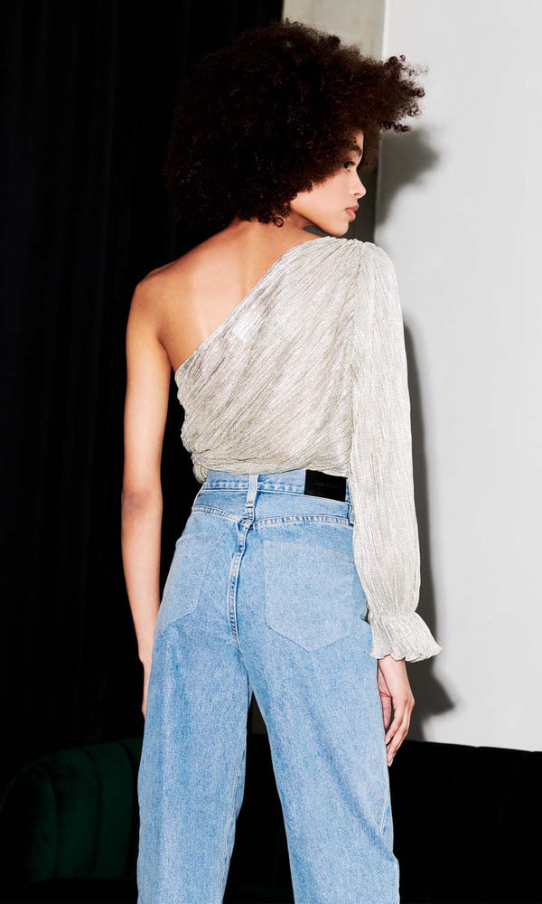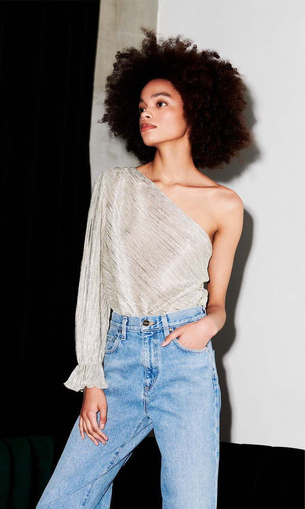Two is company. Highlight the contours of your neckline with our platinum pleated Yael Top. This top is designed with a single long bishop sleeve with a ruffle cuff and elastic opening. It pairs wonderfully with jeans or trousers. • Platinum Pleat • Self:...