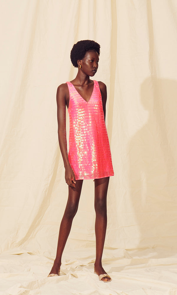 Shift into gear with our Dorah mini, this shift style dress is sure to turn heads this summer! The hot pink mini is adorned in sparkling fringe sequins. The v-neckline and plunge back is flattering to any body type. Style...