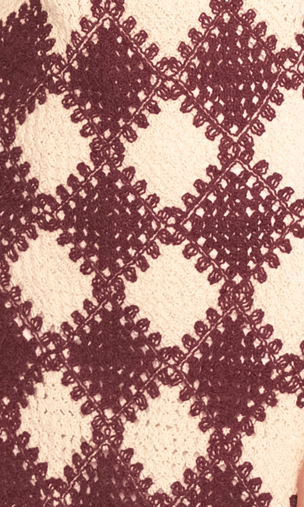 Diamonds are a girl's best friend, and our Dragana is your closets. The diamond crochet dress has fringe trim and a v-neckline. The maroon midi is flirty and fun, and pairs perfectly with heels.  • Diamond Crochet • Self: 100%...