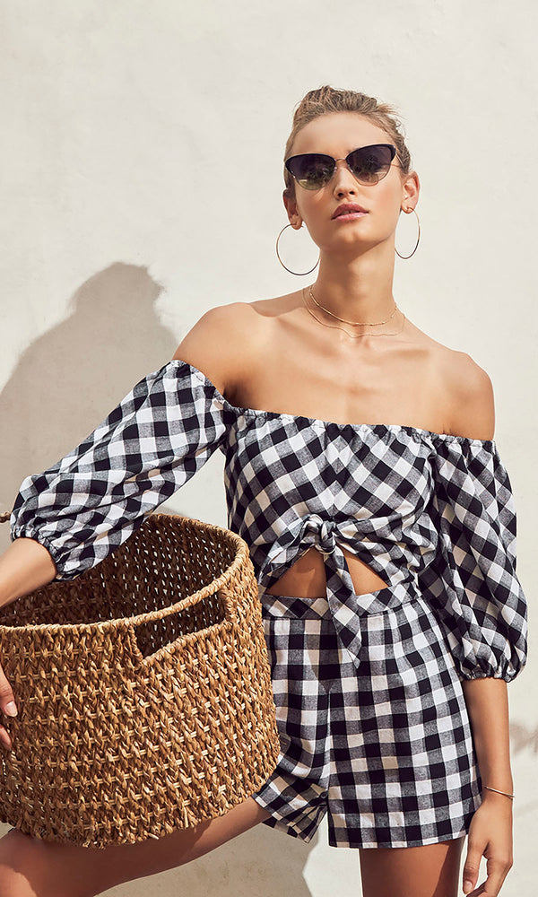 FINAL SALE, NO RETURNS Statement sleeves, off the shoulder neckline, & tie front cutout make this romper just a bit hard to resist. Pair it with slides”and wear it all weekend long. Fabric: Woven check 100% cotton Elastic neckline and back...