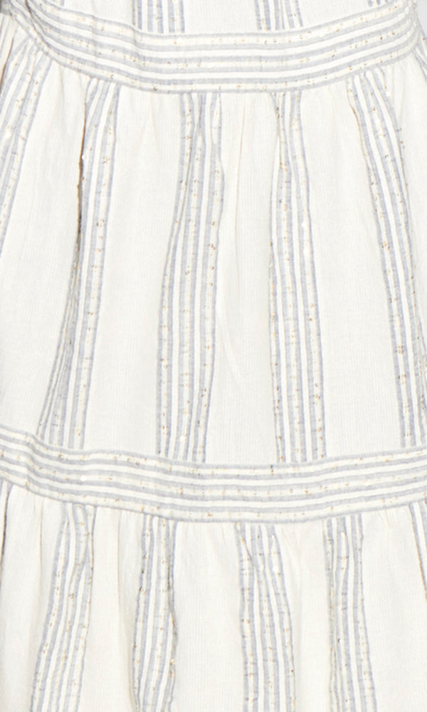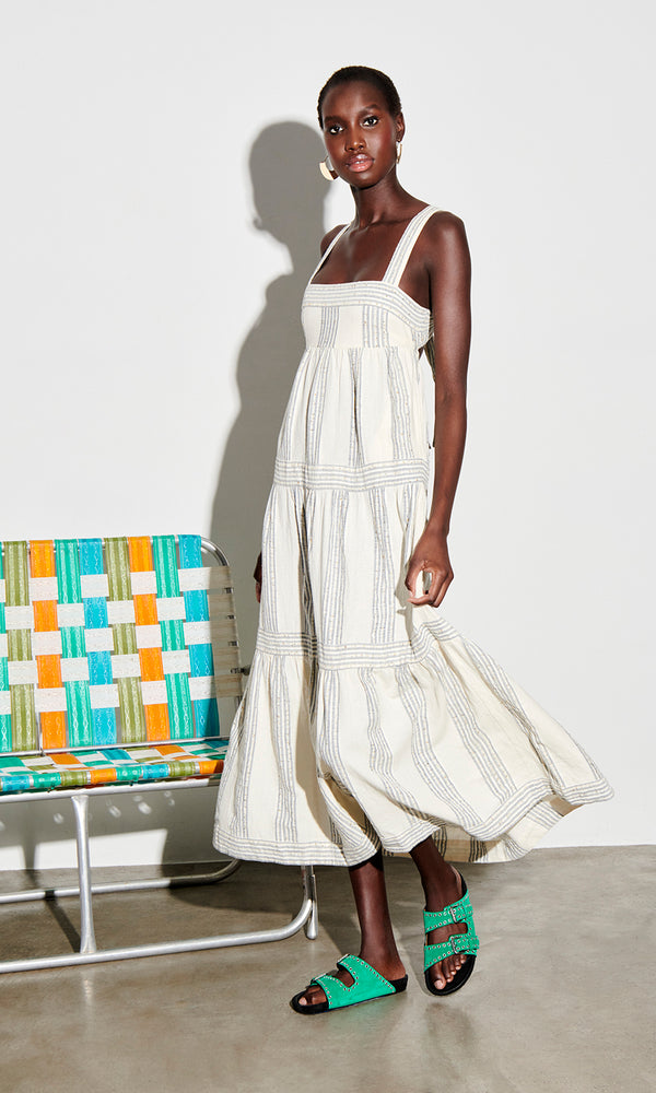 Our breezy Elis dress falls in soft tiers, highlighted by navy stripes and delicate sequins. Made from an airy cotton blend, it's perfect for your beach holiday. The square neckline falters your bust, and the back is finished with a beautiful tie detail...