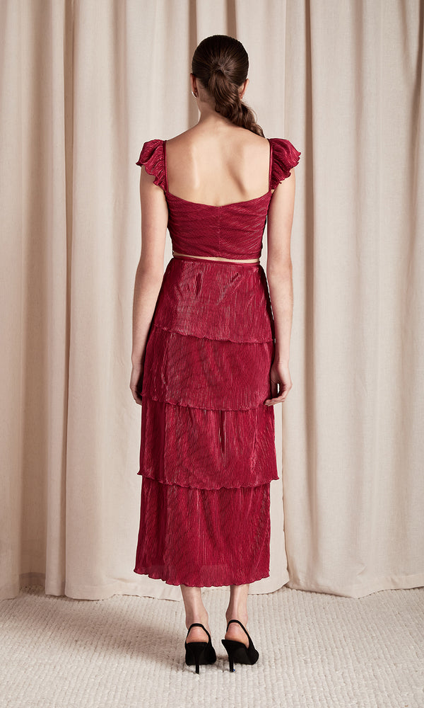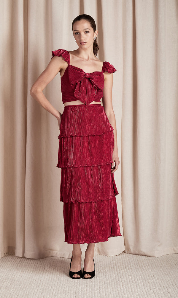 Everlee is RSVP ready. The metallic set is perfect for any holiday party; a crop top with a bow and ruffle straps & matching tiered midi skirt. The holiday ready pair is crafted from metallic fabric with cascades of pleated...