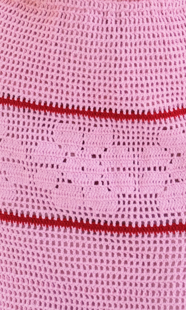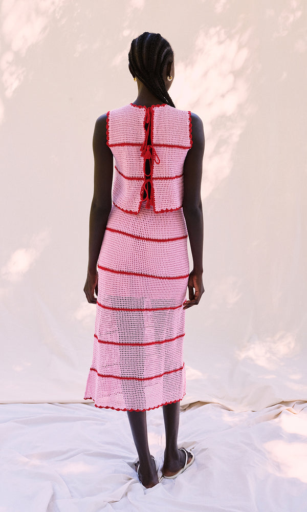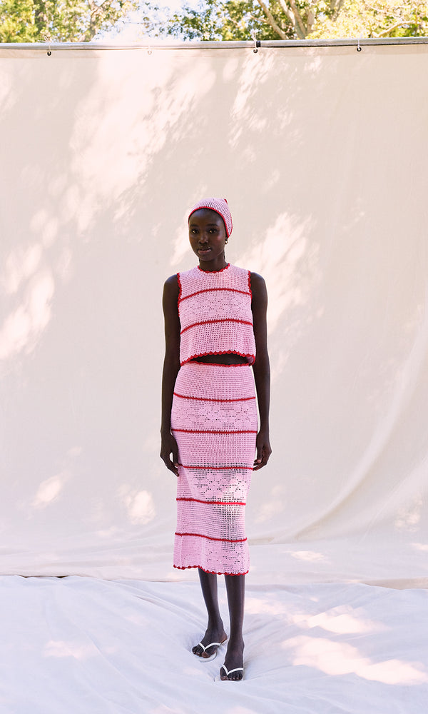 Did someone say charming crochet? Our Fran two-piece set features a tie-back tank top paired with a midi skirt, both in a classic stripe pattern. The pink and red set is handcrafted with care, each set celebrates thoughtful artisanal design....