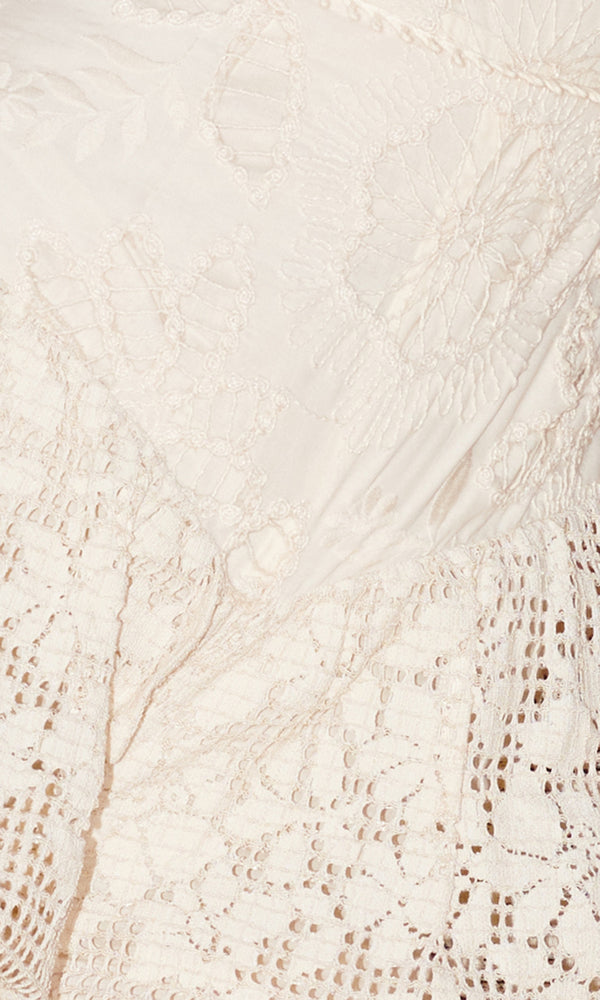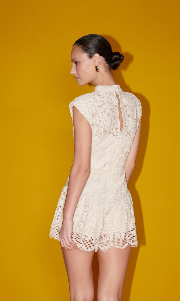 Grace your wardrobe with lace, our Gabi romper is the romantic number your closet needs! The white lace one piece has a playful silhouette and is cut from gorgeous lace fabric with schiffli embroidery. The cap sleeves, mock neck, and...