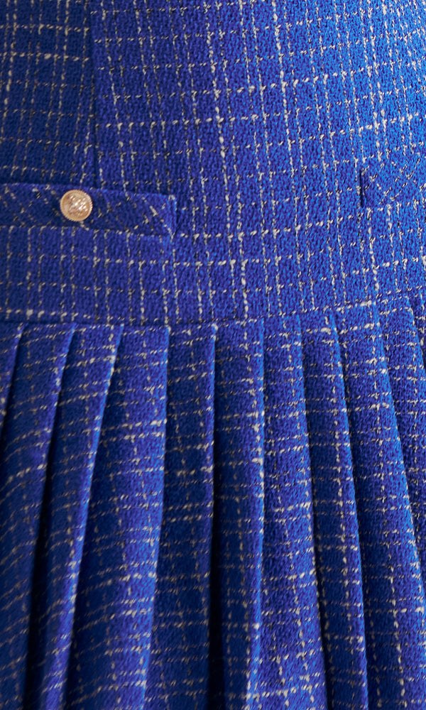 Add a touch of luxury to your wardrobe. Our Iliza dress is made from a royal blue tweed fabric, the mini has gold buttons on the welt pockets that add perfect detail. The classy tweed dress has a drop waist,...
