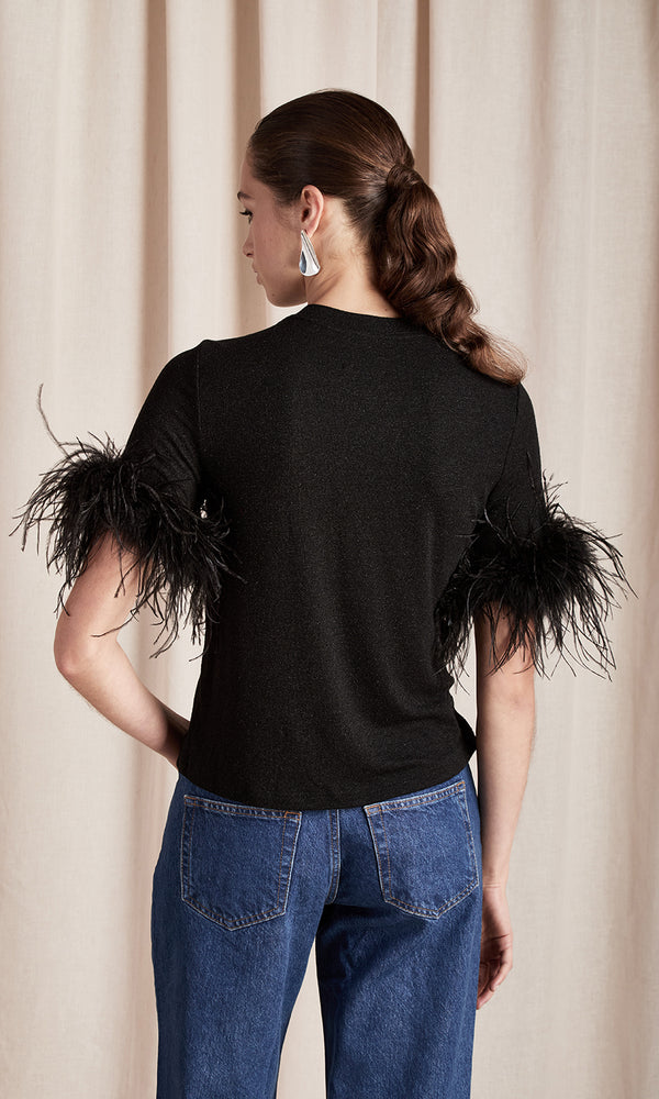 Basics don't have to be basic. Everyone needs a black tee in their wardrobe, we've elevated the everyday basic with our Jade top! The feather tee is made from a metallic jersey that adds a little shimmer to the black...