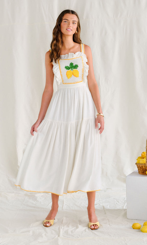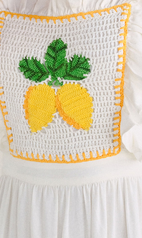 When life gives you lemons.. Our Kathy dress features the motif of the season: lemons! The apron style dress has ruffle details, a crochet lemon panel on the front bodice, and flowing white skirt. Pair Kathy with sandals and a...