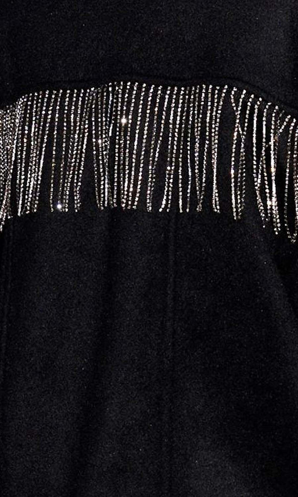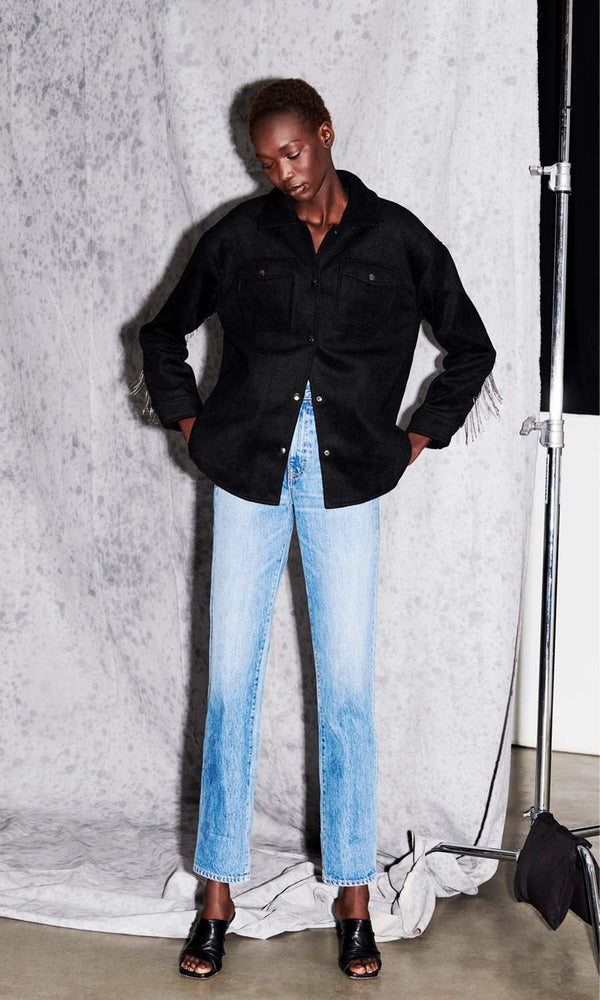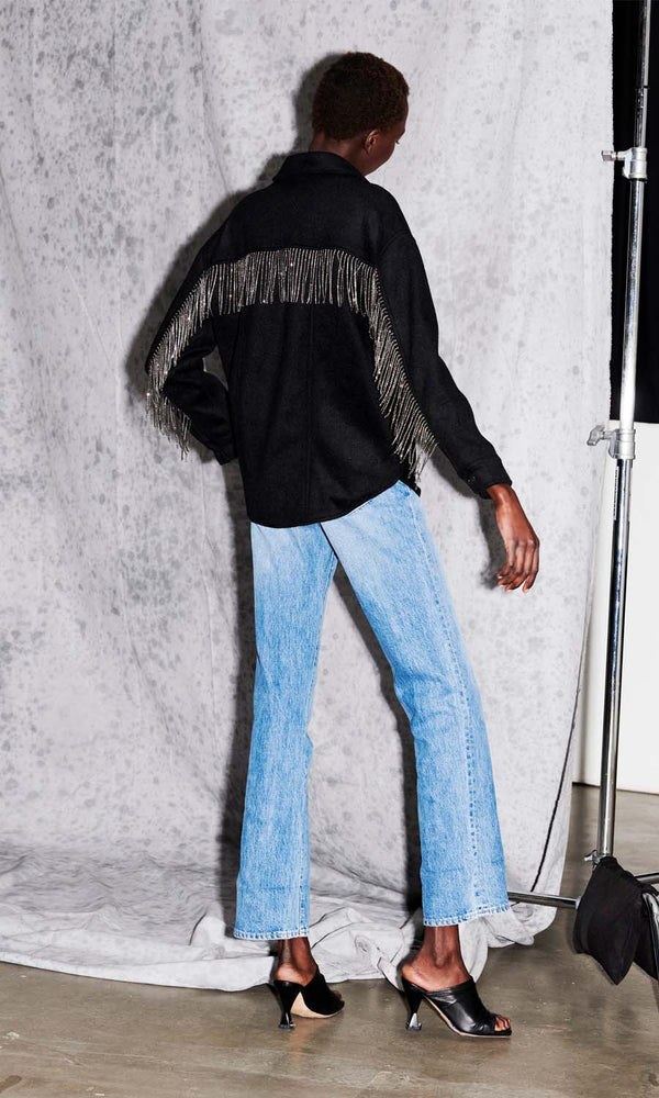 Our Layton Jacket is business in the front, party in the back. This outwear piece features classic flap pockets on the front and sparkling rhinestone fringe on the back. The jacket transitions perfectly from outwear in the fall, to shirting in...