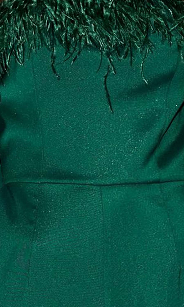 This jumpsuit is a true stunner. Made with a princess seam bodice this strapless jumpsuit has a high waist and straight pant legs. The evergreen feather trim adds a darling finish. This is made to make you feel like a...