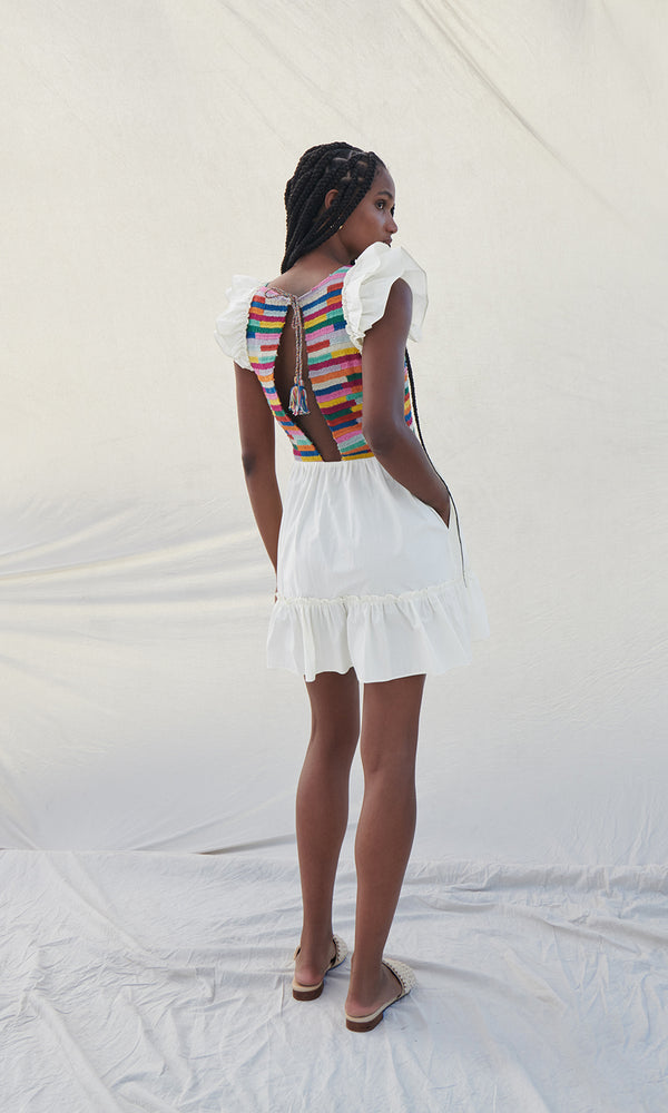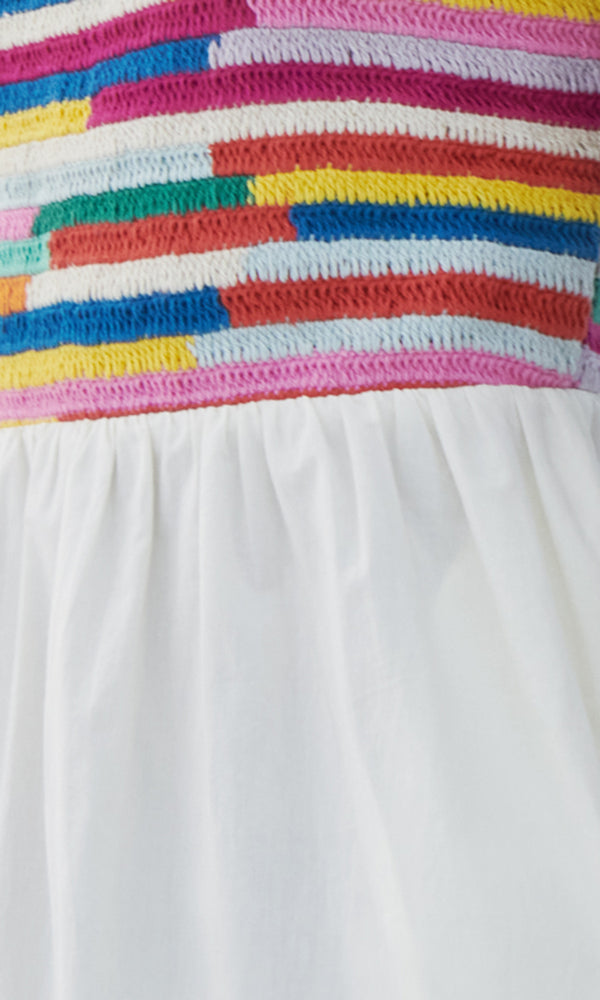 Your spring is starting to look brighter, thanks to our new Leonara! The mini has a rainbow stripe crochet bodice, fluttery ruffle sleeves, and a flowy mini skirt. Not to mention the best part, she's complete with side pockets. Style...