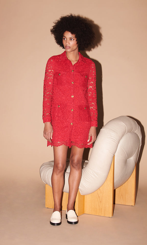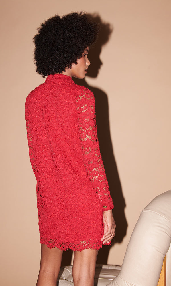 Power reds just hit this fall, and our Luna is ready to make a statement! This a-line mini dress is cut from a gorgeous corded lace fabric, that's delicate, yet makes a bold statement. The front gold buttons and collar...