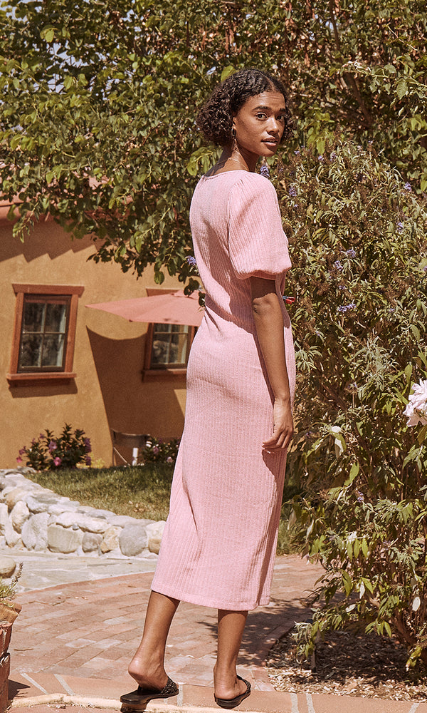 The Malavika midi dress features a scoop neckline detail with buttons all down the front, and cute puff sleeves in this dusty pink. • Rib Knit • Shell: 92% Rayon 8% Spandex • Sleeves are lined • Stretch • Button closure at center front ...