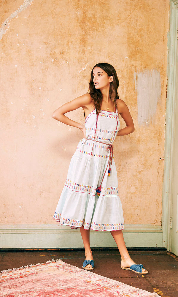 FINAL SALE, NO RETURNS Crafted from yarn-dyed stripes, this trapeze shape midi dress is embroidered at the neckline and thoughout bodice and skirt with a vintage kaftan inspired motif. Easy loose fit makes it the perfect go-to for a hot summer day....
