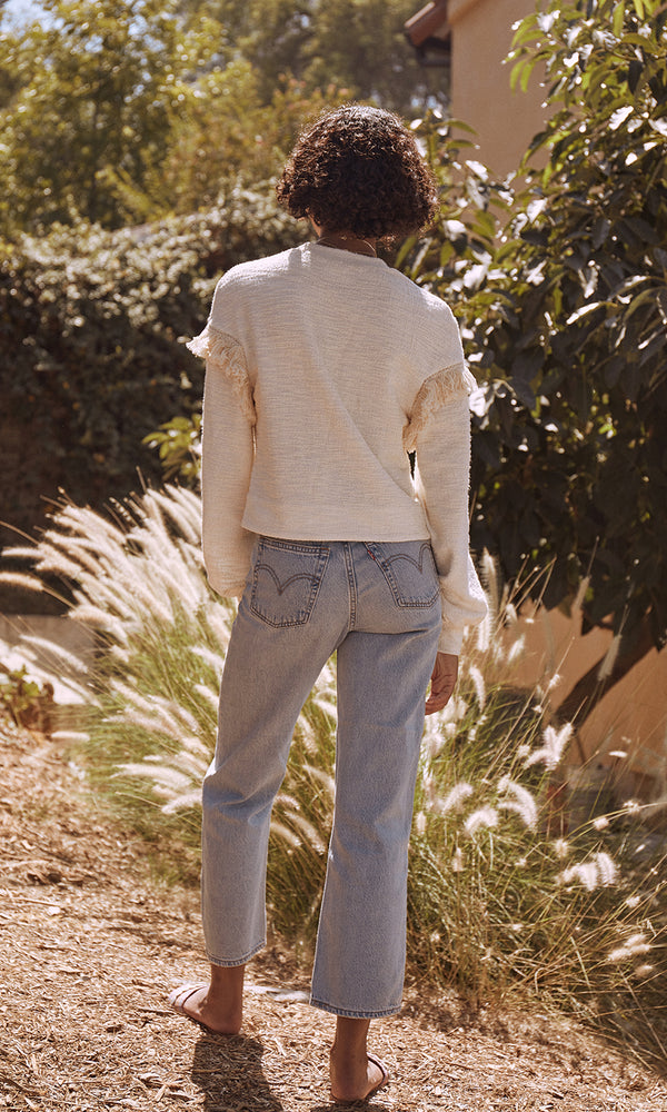Button down fringe knit top with long bishop sleeves accented by fringe on the upper arm. • Fringe Knits • Shell: 54% Cotton 42% Polyester 4% Spandex • Unlined • Stretch • Dry clean only • Imported, China • Model is 5'8" and wears...