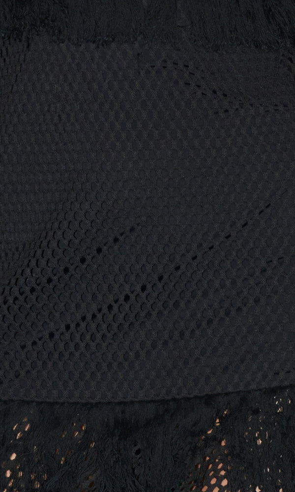Get crafty this season with mesh knit and fringe forward style Meena. The midi is cut from an open weave knit, that gives the black dress a see through design. Meena has fringe trim at the bust, and tiers of...