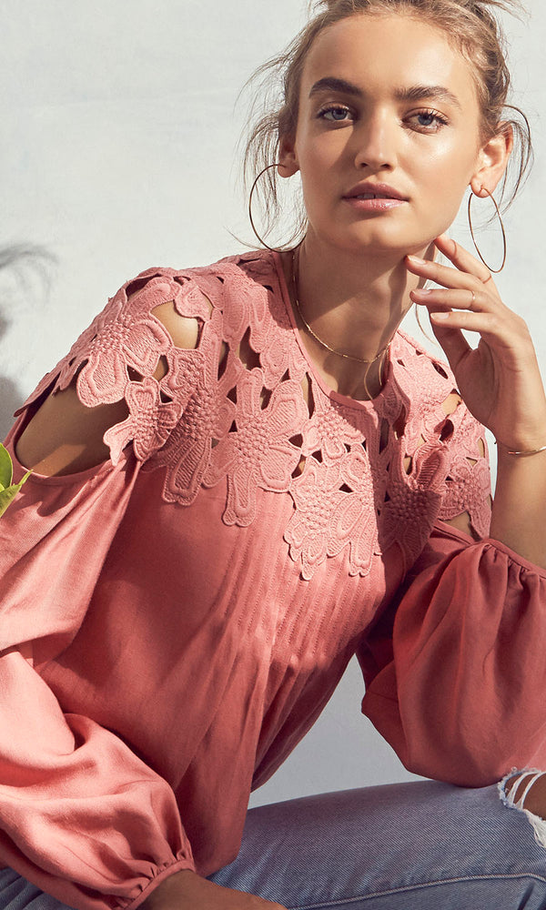Guipure embroidery in oversize floral motif for yoke and sleeve cap. Pintucks detailing front bodice, and full peasant sleeves. Button back closure. Unlined. Fabric: Guipure embroideryShell: 100% polyester lace, with 100% cupro bodyDry clean.Imported, China.