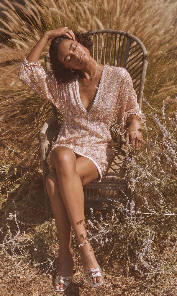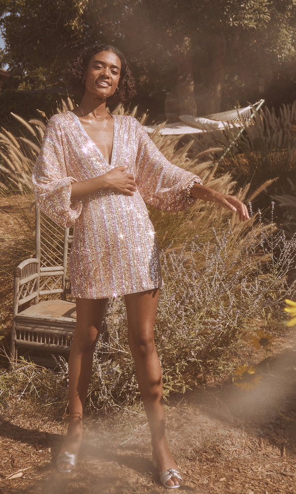 Gorgeous shimmering mini dress with a deep v neckline and bishop sleeves perfect for a night out. • Saint Lucia Sequin • Shell: 95% Polyester 5% Spandex • Fully lined • Stretch • Dry clean only • Imported, China • Model is 5'8" and wears a size small ...