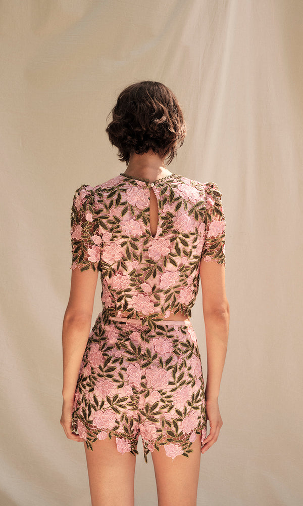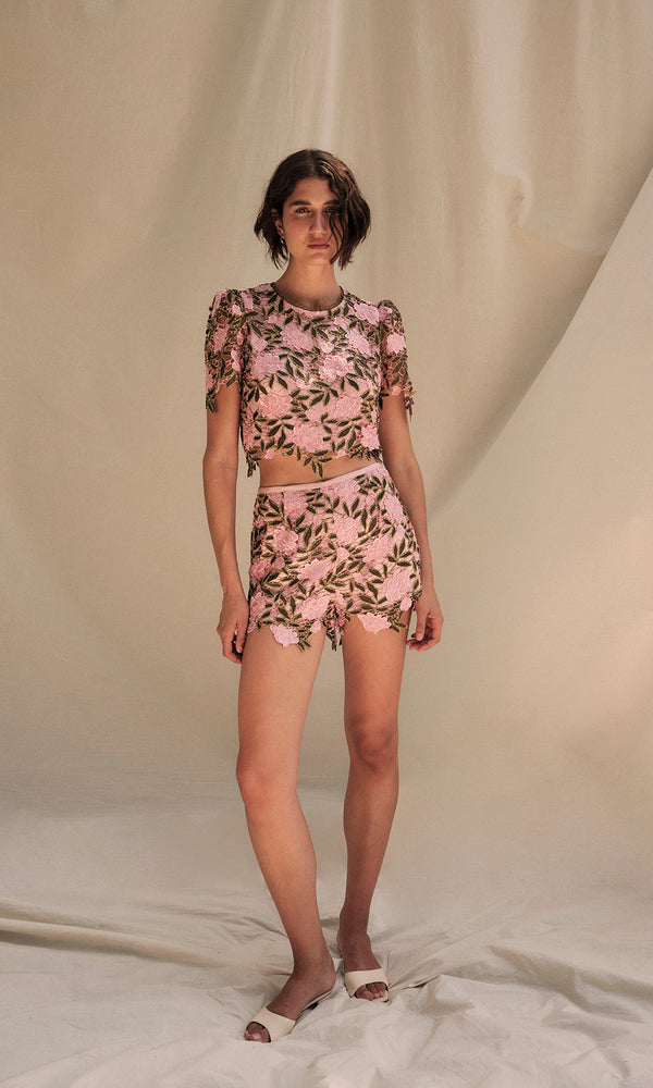 Buy yourself flowers, aka our Morgana set. Our fan favorite two piece is back in a new rose embroidery fabric, ready to bring life to your spring wardrobe! The matching top and shorts are cut from embroidered fabric with a...