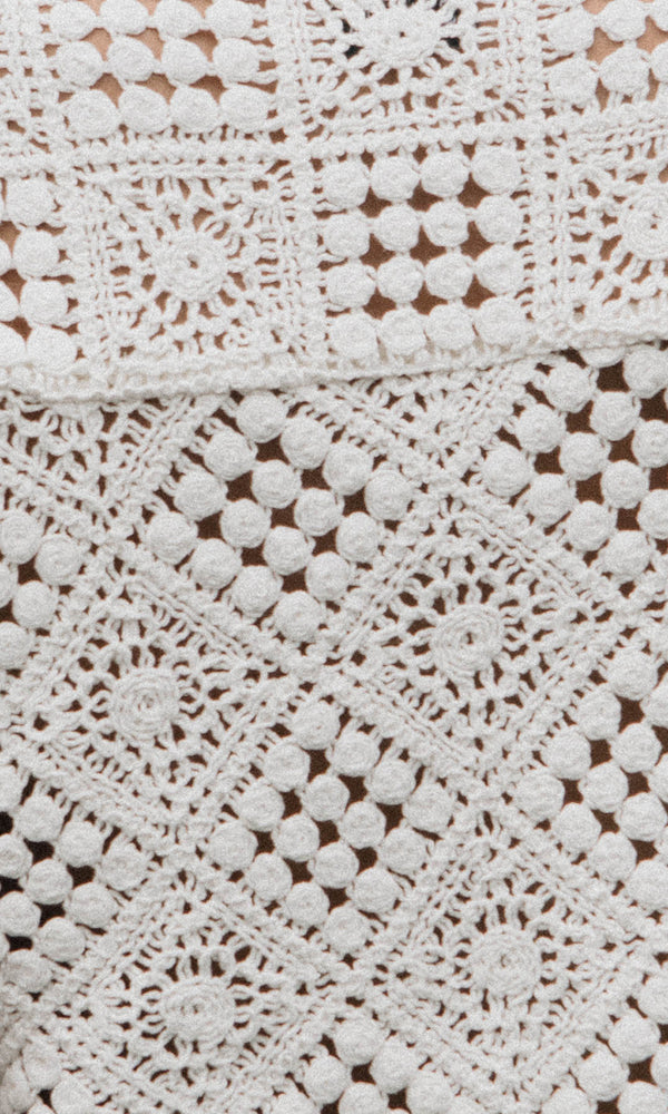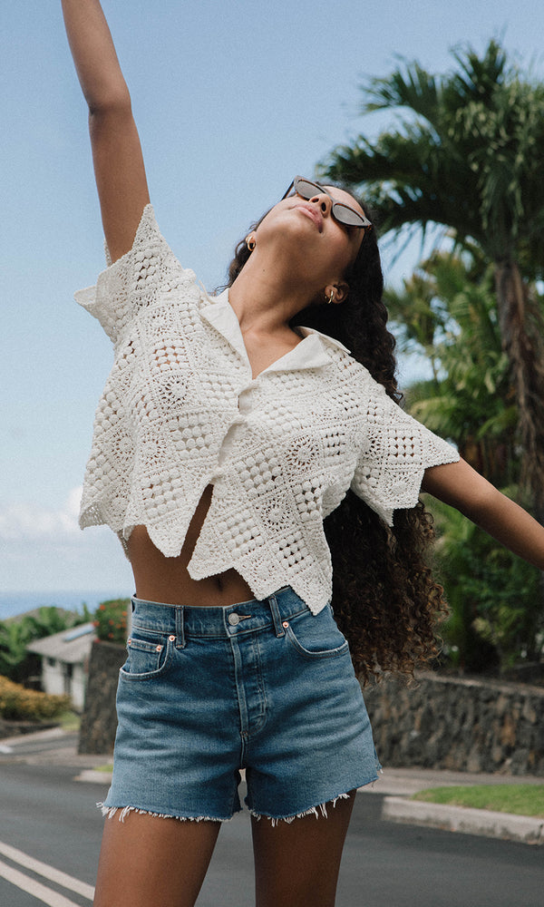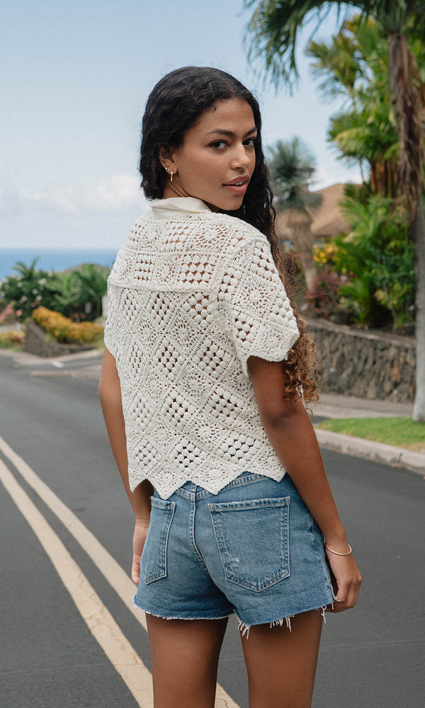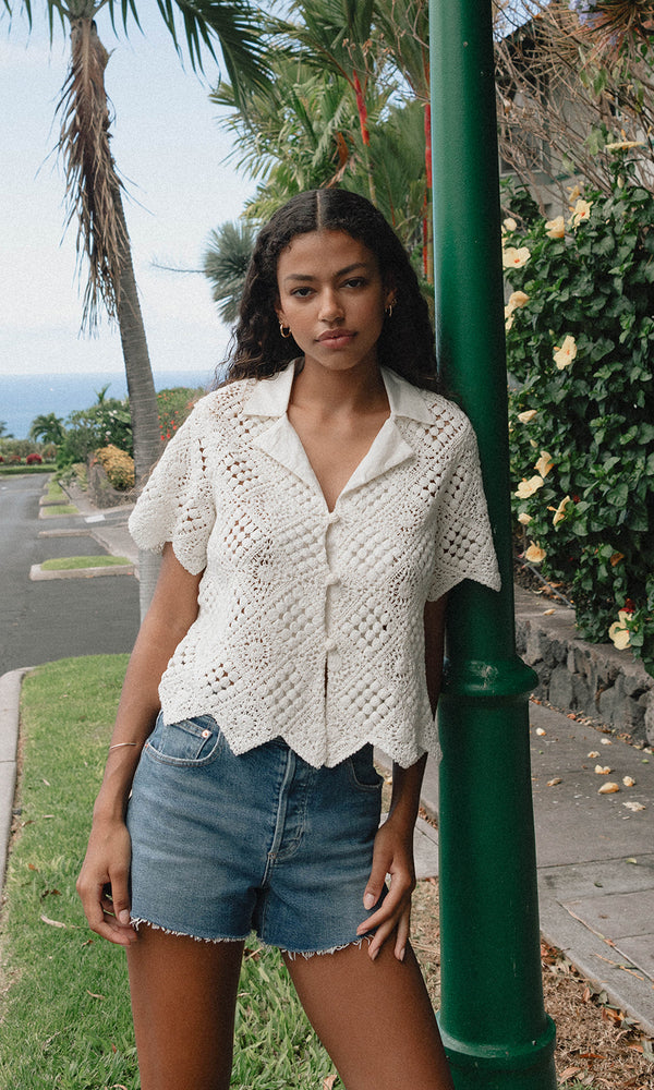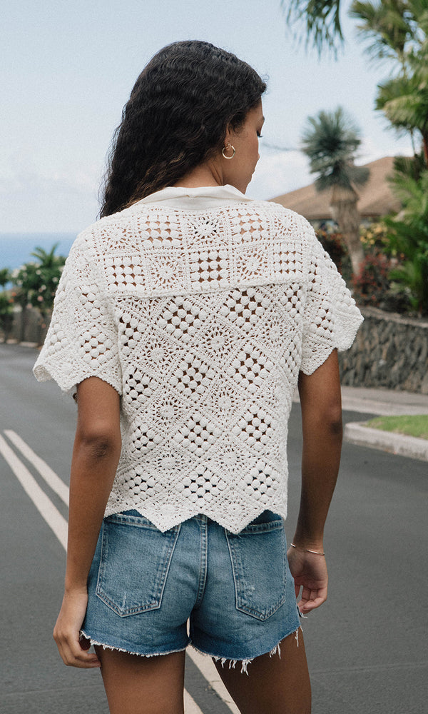 Back and better than ever, our Nan is resort ready! Originally designed for our Spring 23 collection, Nan is not your basic tee: cut from a crochet fabric with a diamond pattern, a collar neckline, and front buttons- the creme...