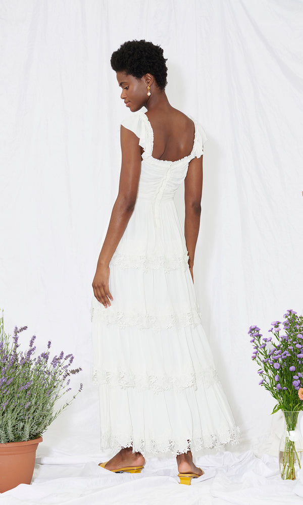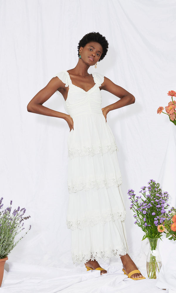 Spring fun looks even better in the Narcissa dress! Woven fabric shapes this sun ready midi dress that has ruffle straps, a sweetheart neckline, and fitted bodice. The tiered midi skirt is accented with dainty floral embroidered trim to complete the...