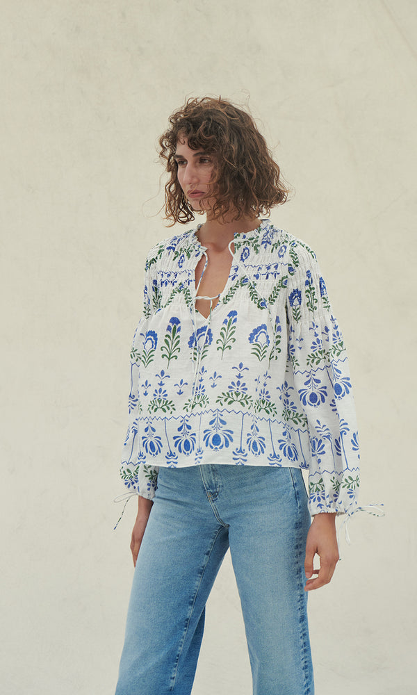 Florals are a stable, and our Orlagh is a must have! This folk floral top has a relaxed fit with long sleeves, tie details, and a beautiful blue floral motif. Style Orlagh with your favorite jeans for an everyday springtime...