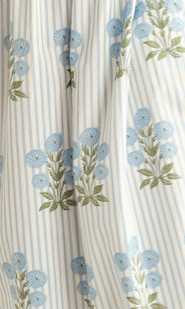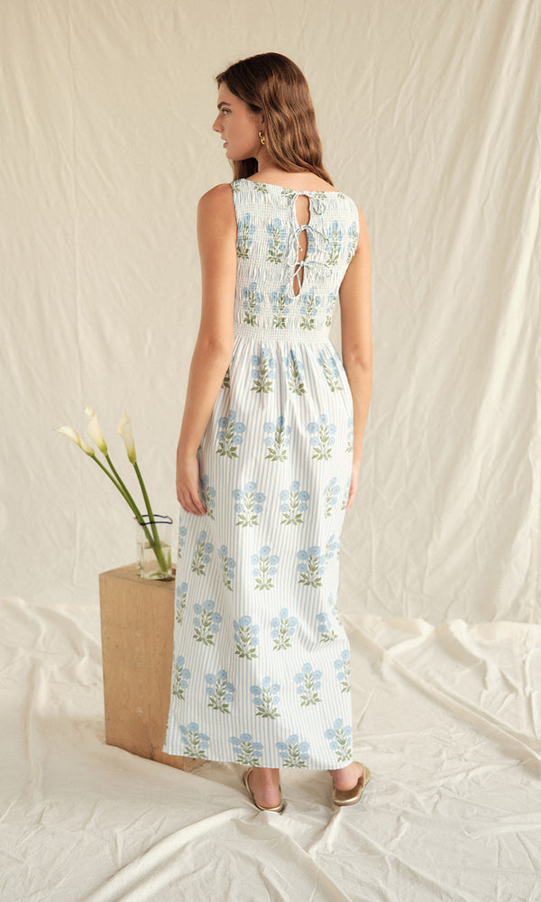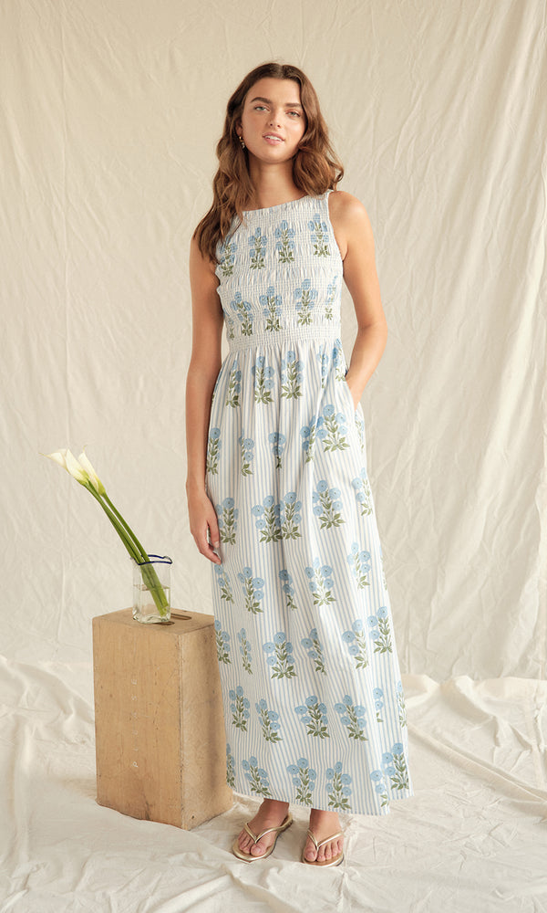 Get ready to plant fresh flowers- make room in your closet for our Paige dress. The stripe floral dress is block printed and cut from breathable cotton. The smocked bodice gives Paige a stretchy, comfortable fit. The maxi has side...