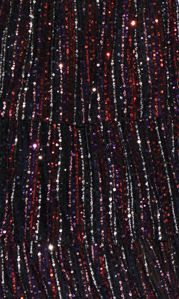 Quintana is the queen of any party. The sequin striped midi has sweet ruffle sleeves and tiers throughout the skirt. You'll twirl the night away in this statement piece. Pair with strappy heels and add your favorite handbag, the last...