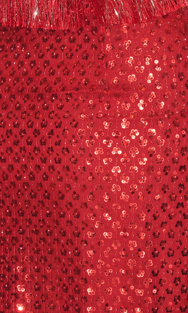 Set the tone for the holidays with our Randall set. This red hot set is cut from a sparkling ruby fabric with a floral sequin design. The top and midi skirt are finished with a fringe trim along the hem....