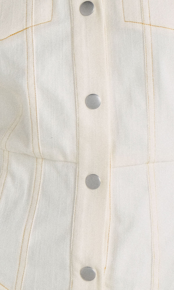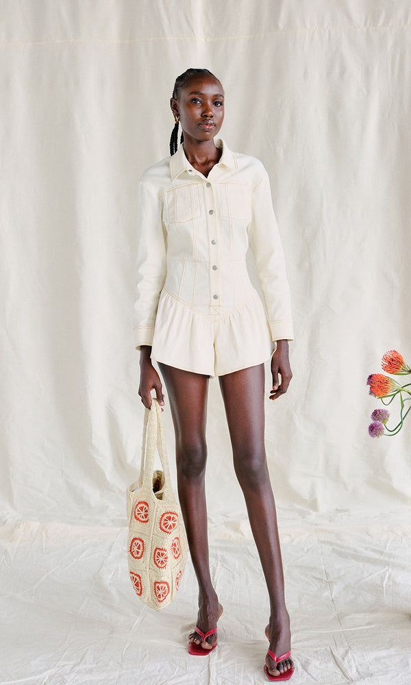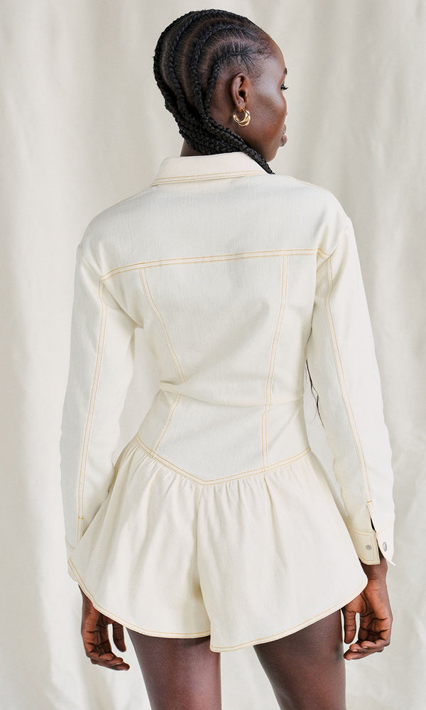 Our Rhea romper is back from our fall season, this time in a butter hue. This denim dream features cheeky ruffle shorts, a collar to keep things sophisticated, and long sleeves- perfect for cuffing. The light butter color is perfect...