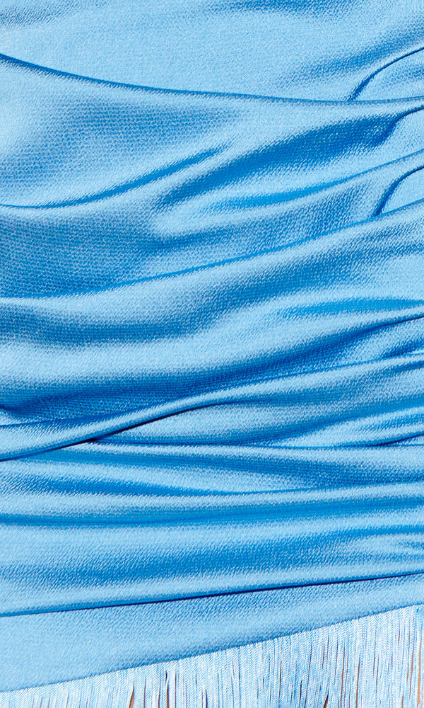 Sainte is your new party plus one! This asymmetrical mini has a one shoulder silhouette, a ruched skirt, and a fringe trim. The standout mini is cut from silky satin fabric in a gorgeous french blue color. Pair the flirty...