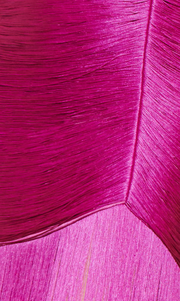 Hue me? Go bright in our Sally dress! The spaghetti strap midi is covered in horizontal fringe, in a bright orchid color. You'll be pretty in pink in the perfect party dress, sure to make you twirl. Style the dress...