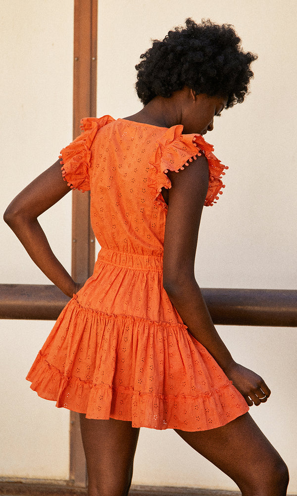 The perfect outfit to lose your sandals to the tide in. Cotton eyelet mini dress decorated with dot embroidery trims and tassel tie ends and a swingy tiered skirt made for dancing. • Tangerine Eyelet • Shell: 100% Cotton • Lining: 100% Cotton • Skirt is...