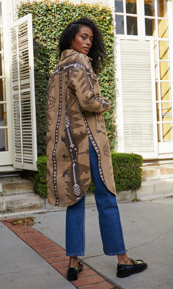 Long button down coat in geo woven print. • Geo Woven • Shell: 100% Polyester • Lining: 100% Polyester • Fully lined • Pockets at sideseams and front bust • Buttons at front bust pockets and front closure • Dry clean...