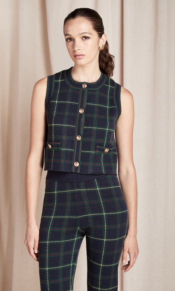 Smart style has never been so cool! Our Tilden top is cut from a stretchy plaid knit fabric. The vest top hits at the perfect spot to pair with jeans or trousers, and the gold buttons add chic detail. Wear...